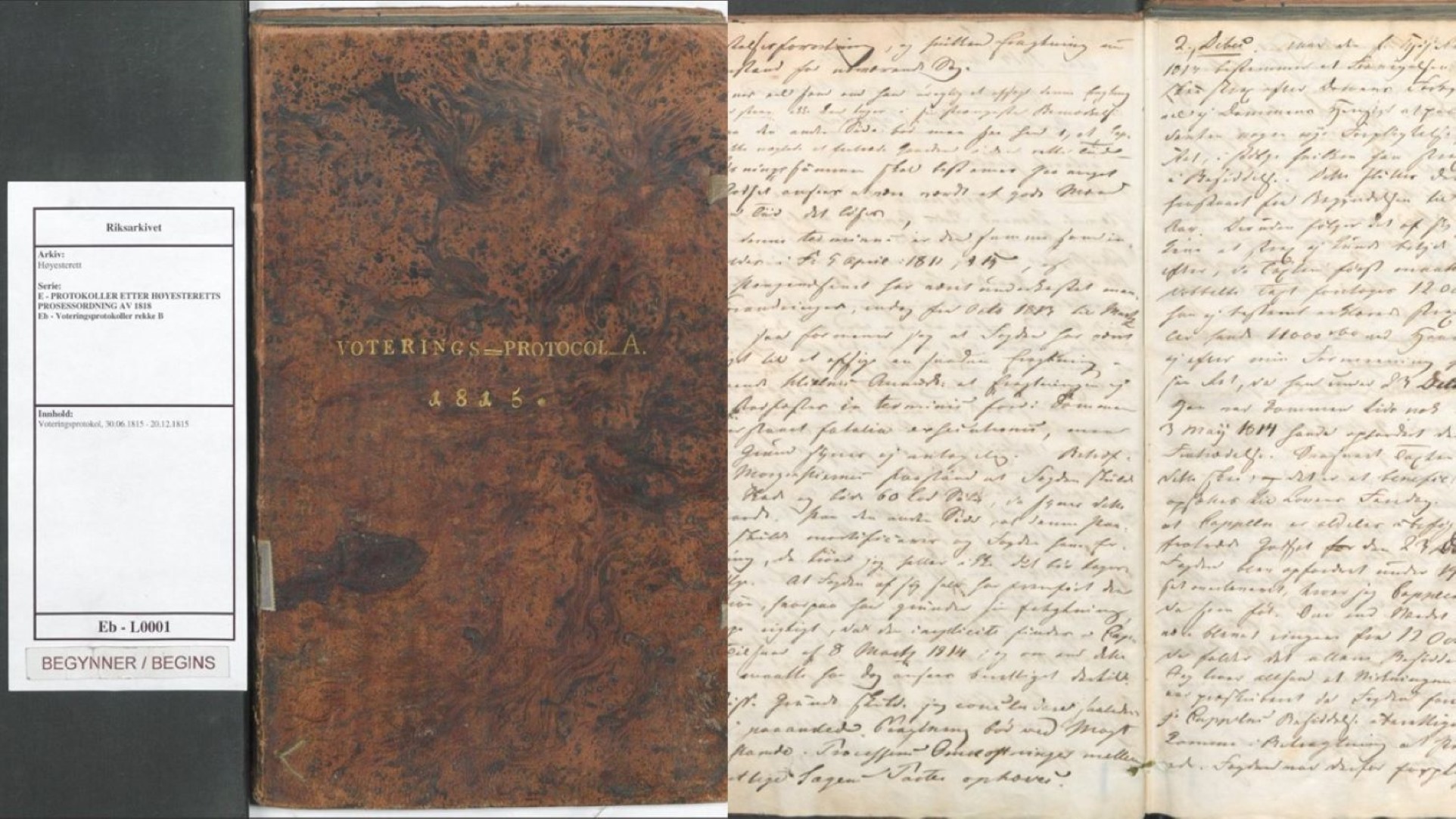 Høyesterett, RA/S-1002/E/Eb/Eba/L0001/0001: Voteringsprotokoller / Voteringsprotokoll, 1815, omslag og s. 4-5. Foto: Arkivverket.