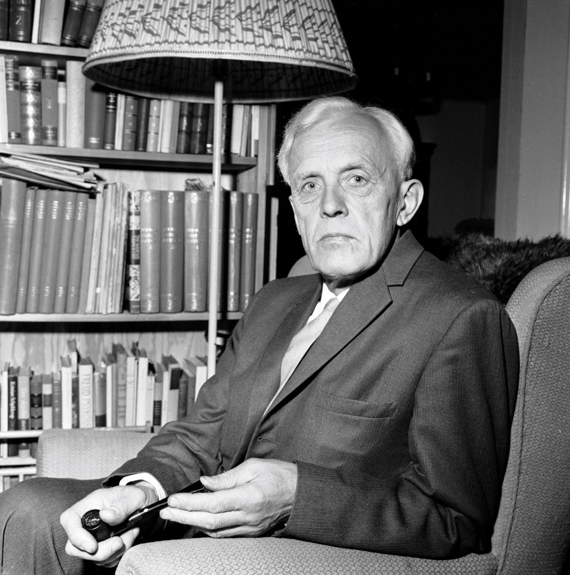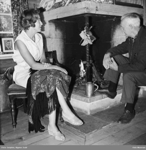 Helge Ingstad og kona Anne Stine Ingstad fotografert i sitt hjem i 1964. Foto: Rigmor Dahl Delphin/Oslo Museum. Lisens: Public domain.