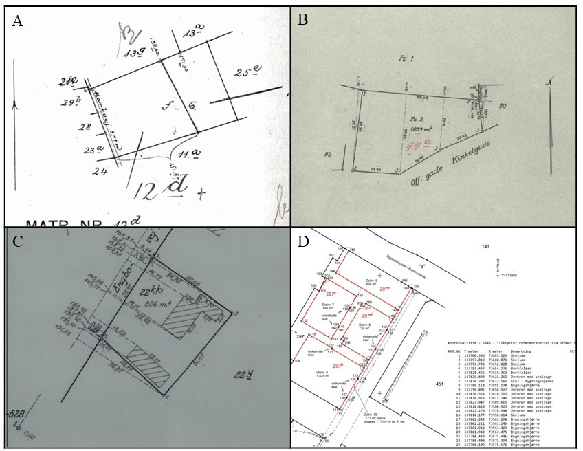 Relativt bestemt: uden anvendelige målforhold, som historiske matrikelkort og måloplysninger udelukkende med dimensionsmål, se figur 2, A.