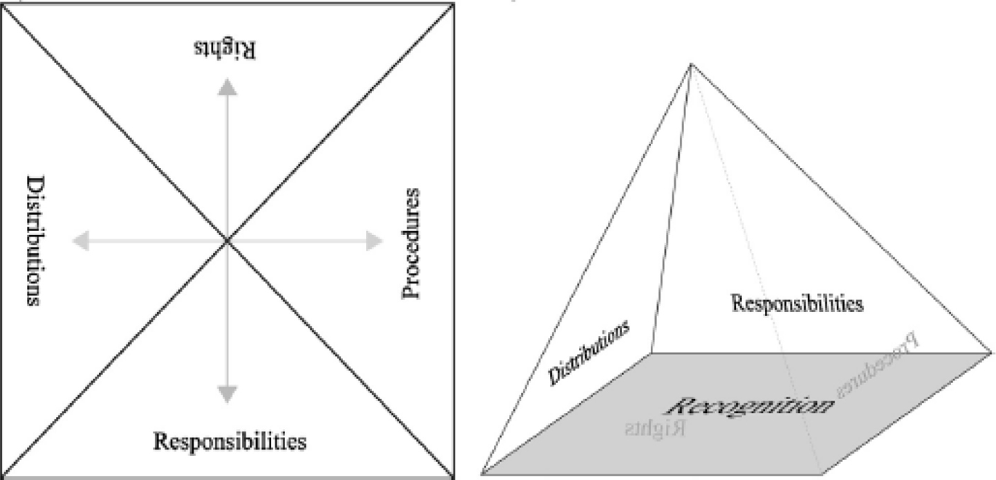 To assist in analysing particular contexts, climate justice aspects that compete within these discursive spaces are identified as responsibilities, rights, distributions, procedures and recognition, where recognition is a dimension in which injustices are linked to ‘cultural or symbolic injustices’. Bulkeley et al conceive of these within a pyramid, rather than a two-dimensional ‘plane’ as in statist iterations, ‘where distributions, procedures, rights and responsibilities form the four triangular faces, and recognition (…) the square bottom’; consequently, ‘each facet (…) is bound to’ and ‘filtered through the others, refracting and reconfiguring what (…) justice entails in any one context:’